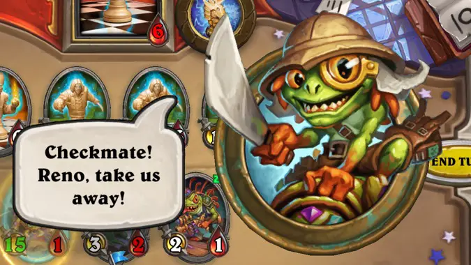 The toughest part of this Brawl is the final fight, where you dual with one of your fellow League members. (Why? Who knows!) This fight is styled after Rastakhan’s Rumble: each hero has a totem you have to deal with, and the totem can be from either class that the hero represents, so it can be different each run. Just pay attention to what it does and try to keep it out of play as much as possible — you should be fine.