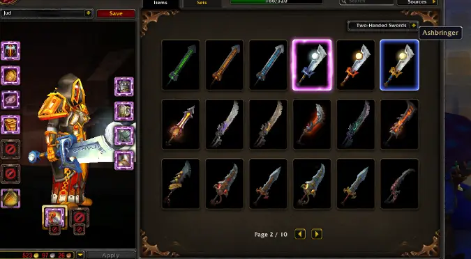 As you can see, my poor Dark Iron is too broke to apply the appearance, but she does have it saved. Just make sure to choose the Ashbringer from the Two-Handed Swords category, not the Artifact category. The Artifact version will transmog only when you’re in Retribution spec and won’t save to appearances, while the Two-Handed Sword version will save and can be applied over 2h weapons even if you’re in Prot or Holy spec.