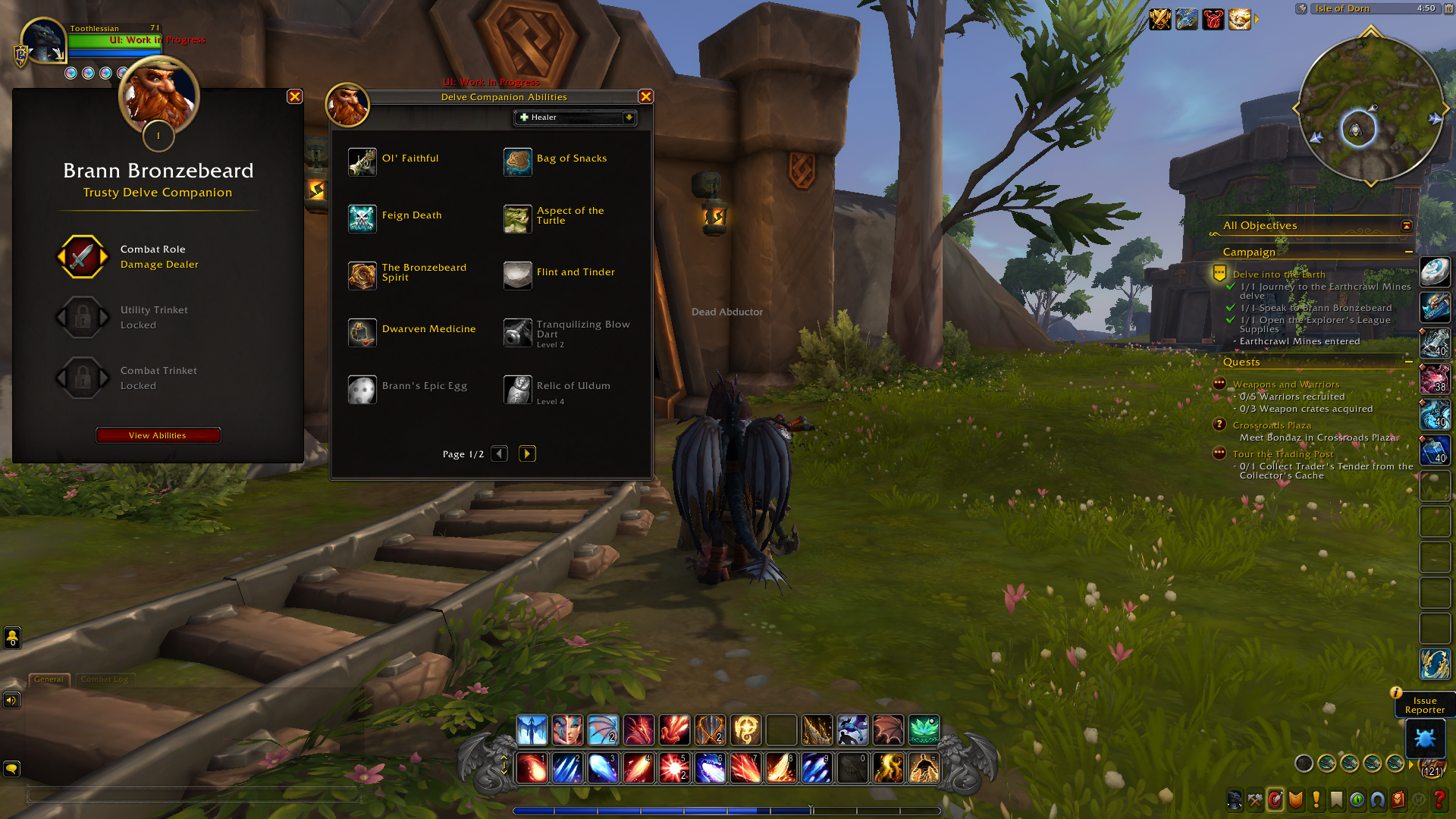 When you find a Delve, your NPC Companion will be near the entrance, which looks like a foggy barrier. In Season 1 of The War Within, the NPC companion is Brann Bronzebeard, but in later seasons we’ll work with new NPCs who will probably be part of the Dragonscale Expedition. Interacting with your NPC companion lets you set their role, check their abilities, and manage their utility and combat trinkets.