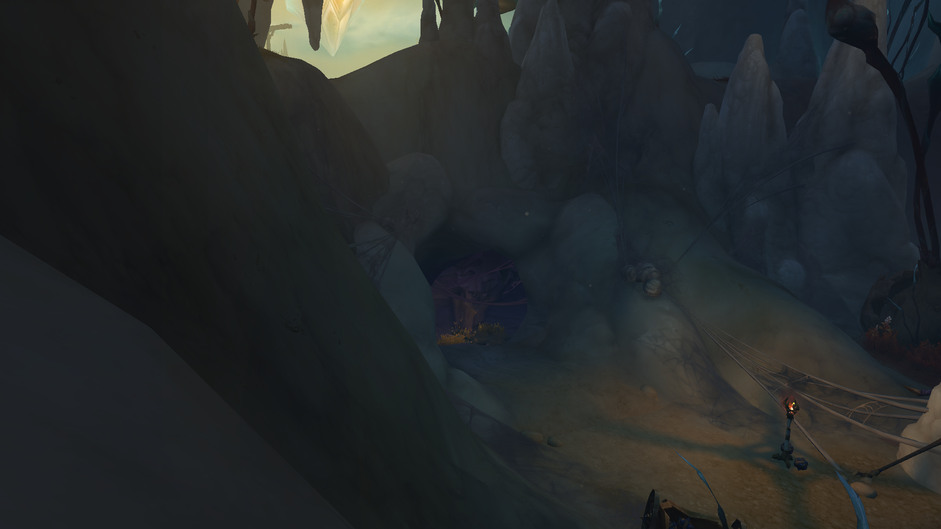 - Nightfall Sanctum is directly west of Mereldar, Hallowfall’s sanctuary area, and north of the Veneration Grounds area. Go over the ridge to find the opening to this Delve at the base of the waterfall. Flight Master Anje Noon in Mereldar is a good flight path to pick up to get here quickly in the future.