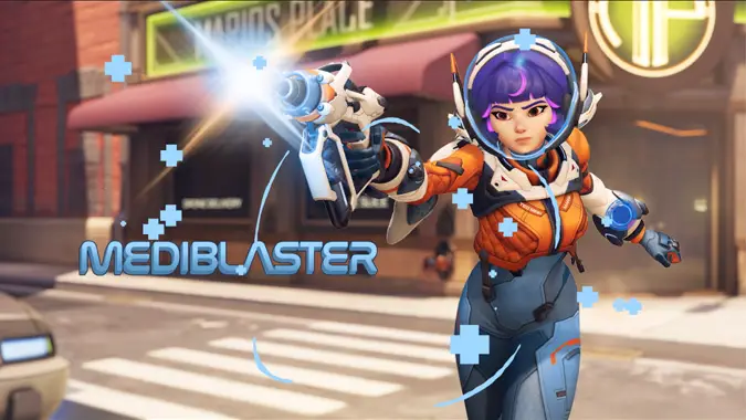 Her primary fire weapon is the Mediblaster. It’s a burst fire weapon that heals allies and damages enemies, which is very reminiscent of Ana’s rifle. When pointed at allies, the blaster has a smiley face, and when pointed at enemies, it has an angry face.