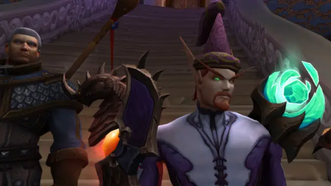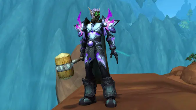 Looking at the cloth set made me feel like going to a party. There’s just something about a nice purple and white robe that screams “celebration.” With WoW’s 20th anniversary coming up in November, you can swap out a few items to max out the festive meter.