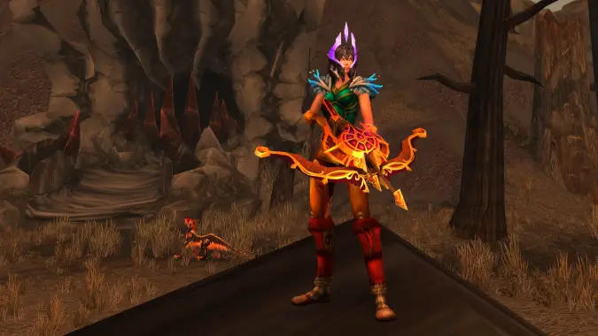 You can pull out whatever you’ve got in your wardrobe for this one, as long as you follow the colors of the rainbow from bottom to top. The crossbow from the event, Dalaran Defender’s Bolter, matches the middle of the spectrum really nicely, but again, you can use whatever yellow-orangish weapons you have that match the rest of the outfit best.