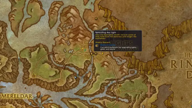 When you hit Renown rank 3 with the Hallowfall Arathi, Spreading the Light unlocks in the northeast area of Hallowfall near Light’s Blooming and the Hillhelm Family Farm. The weekly quest associated with the event is also called Spreading the Light and it has two objectives you need to do to complete the event: