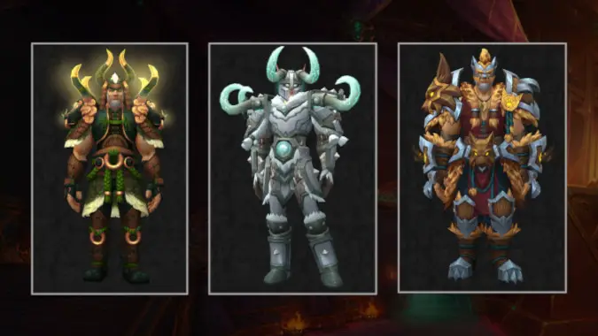 Death Knights get the Exhumed Centurion’s Relics, a perfect fit for the frozen undead berserker on the go. There are a lot of great details, but my favorite is the chipping on the spikes that suggests a battle-hardened veteran ready for their next foe’s end. The Evoker ensemble, Destroyer’s Scarred Wards, gives us a vibrant reminder of Deathwing’s reign of terror. The cloak is unique, the boots scream “ready for adventure,” and the fiery shoulder effect is a can’t-miss.