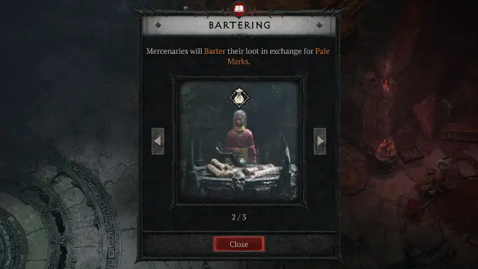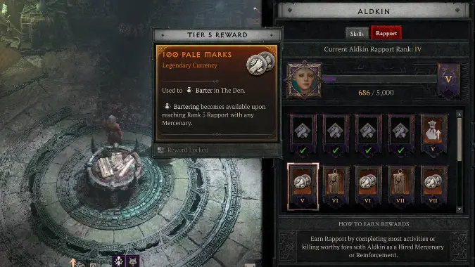 Bartering uses a dedicated currency called Pale Marks. As you level up your rapport with the various Mercenaries, it unlocks a greater number and variety of rewards to barter for. Rewards include legendary equipment and rings, gem fragments, master working crafting materials, boss summoning materials, and gold. The quality of the rewards available increases with the renown level.