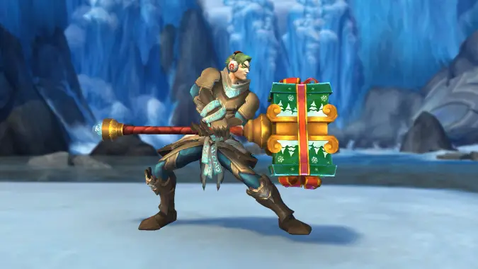 There are a few kinds of thematically available ensembles, weapons, and armor transmogs this month. We have the jubilant festivity of the Winter’s Veil holiday event, the coldness of the winter season, and for some reason Valentine’s themed items. Two immediate standouts are the Cheerbringer XL, a two-handed mace transmog, and the Crystalline Longbow of the Heavens. I don’t know what the WoW team has going on but they keep bringing the heat with these bow designs, even during the North American winter months.