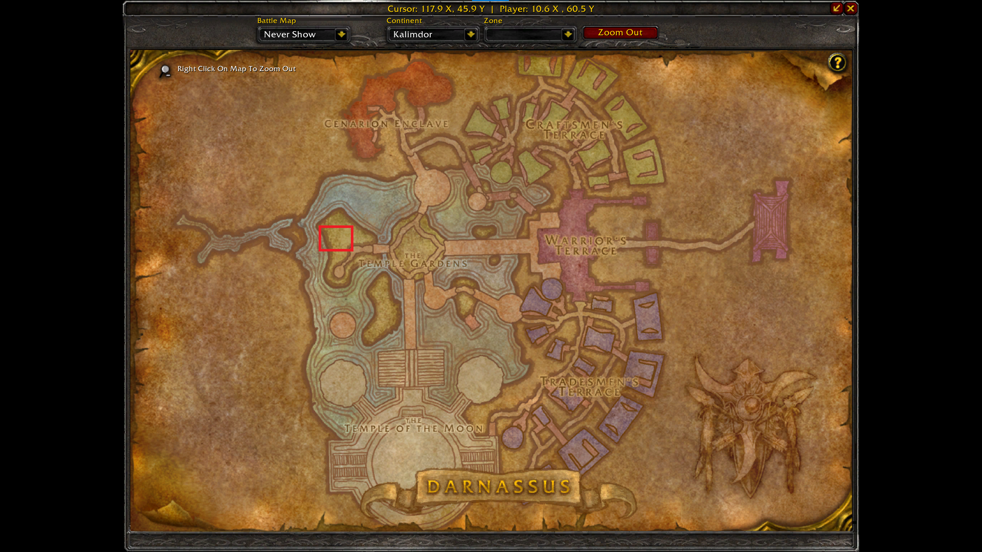 - Shadowglen, Teldrassil (58, 43) — Behind Conservator Ilthalaine, towards the building at the base of Aldrassil.