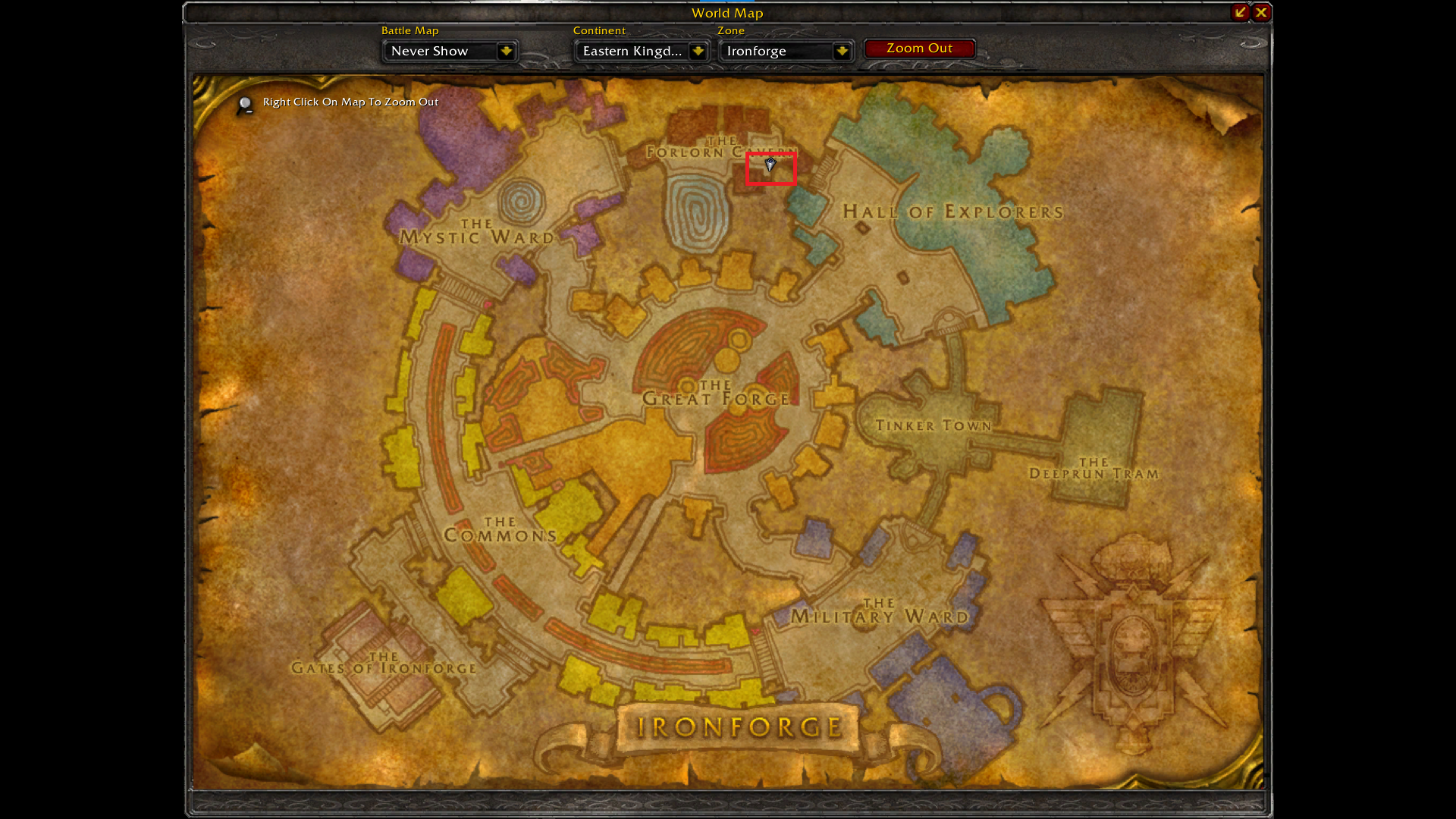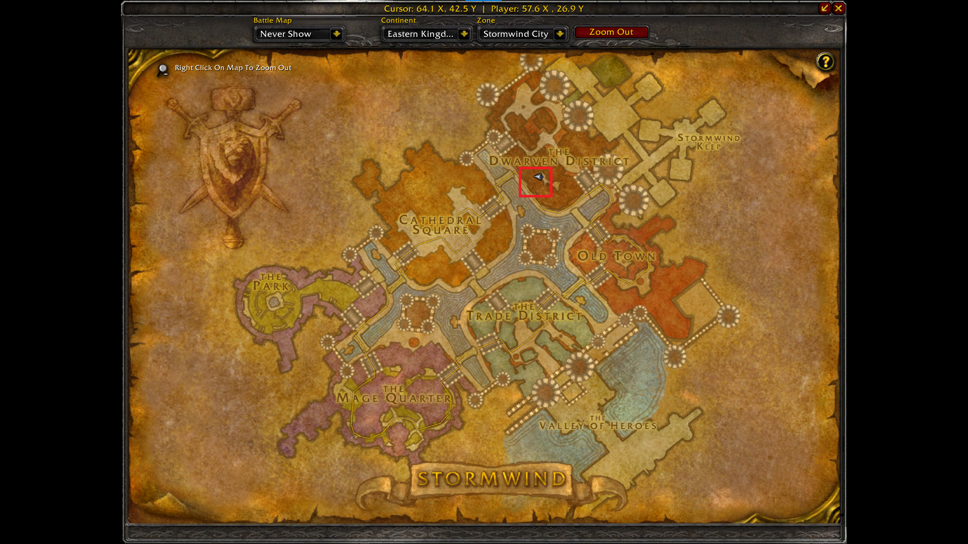 - Cut-Throat Alley/Dwarven District, Stormwind City (57, 26)