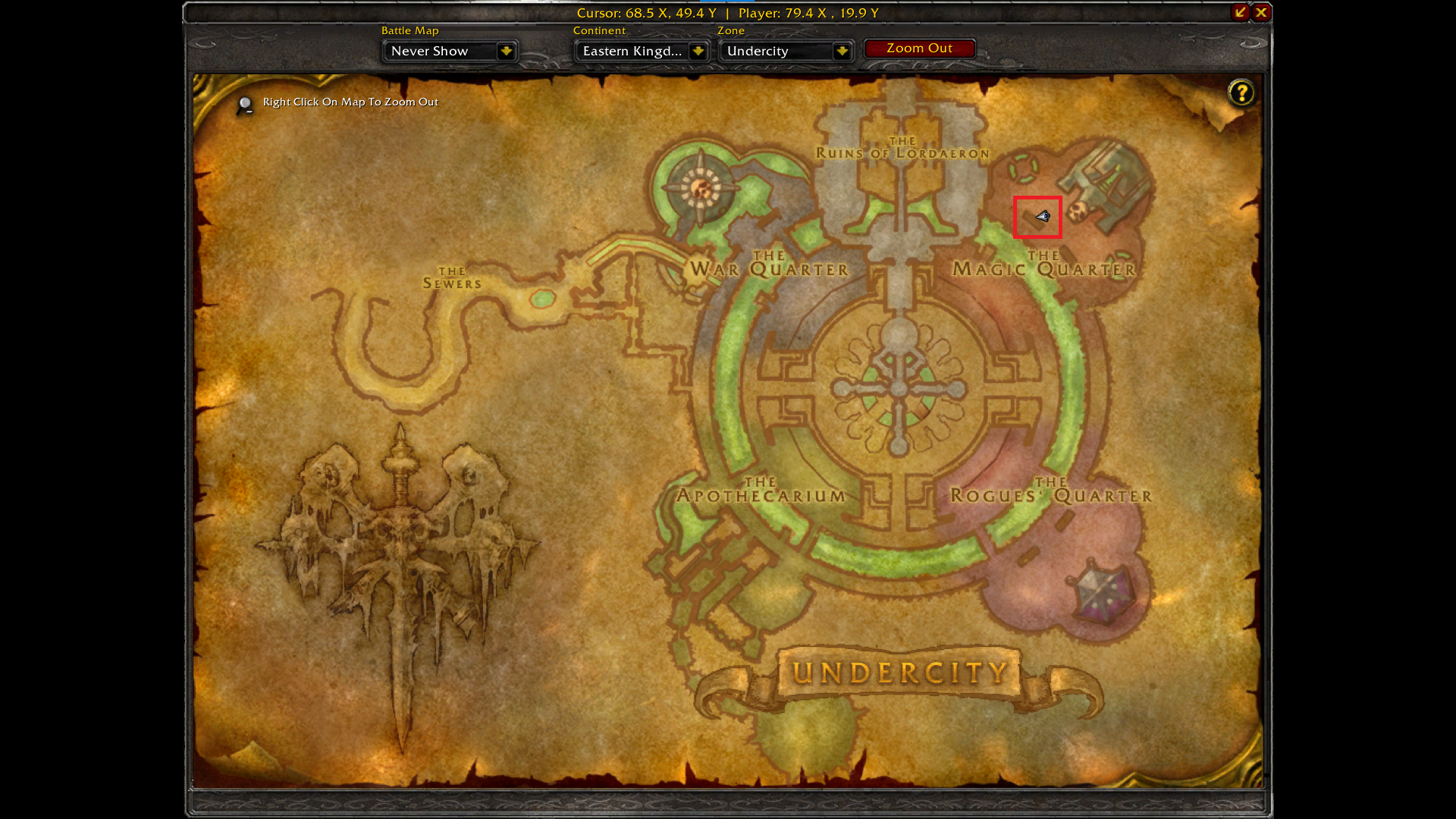 - Deathknell, Tirisfal Glades (31, 66) — In front of the first building to the left once you enter Deathknell from Shadow Grave.