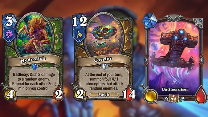 This will be the biggest miniset Hearthstone has ever released, with 49 cards instead of the usual 38 we’ve gotten in other minisets — that’s four Legendaries, one Epic, 20 Rares, and 24 Commons. The three StarCraft factions will be present in the miniset, in a mechanic that feels very similar to the three gangs from Mean Streets of Gadgetzan: each faction will be available to a few specific classes, and those faction cards will all be “multi-class” cards, playable by all of them.