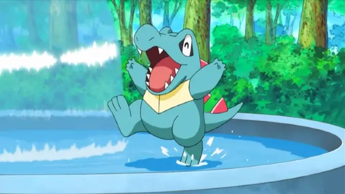 I really like Chikorita but Totodile is my bro. Look at him. He just looks like a good friend you can rely on, and he likes to have fun — splashing water everywhere, probably.