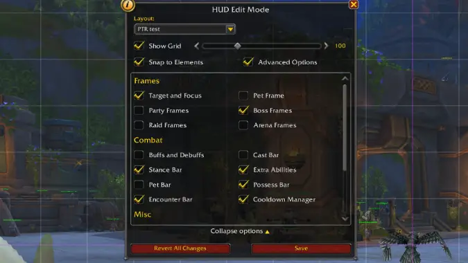 If you want to move the frame, you will need to enter the HUD Edit Mode via the main menu. Once again, by default editing this component is inactive — select the frame group at the bottom of the list of Combat frames. This unlocks all four frames and you can move them to your preferred location. You can also change the visibility of any of the frames on a frame-by-frame basis, your options are: