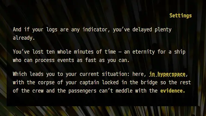 The first of three Interactive Story nominations this year — think “Choose Your Own Adventure”, but on a computer instead of a book — a Death in Hyperspace is a murder mystery that you as the ship’s AI must solve before time runs out (there is an option to play without a time constraint if you don’t think you can handle the additional pressure). You can interview characters, find physical clues, and keep track of who you suspect all within the friendly(?) confines of the web browser. There are eleven possible endings — can you solve your captain’s murder?