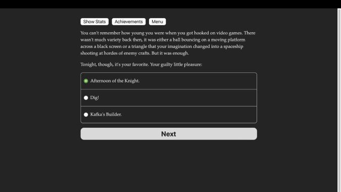 The second of two nominations this year from Choice of Games, Restore, Reflect, Retry is an interactive horror novel set in the 90s. You and your friends discover a game and you all start to play. And play. And play. Nobody remembers how you actually found the game, and the stories keep changing. Can you solve the mystery of the game’s origins and also save your friends? And what’s this about a ghost living behind the game’s screen? Or are you the ghost in front of its screen?