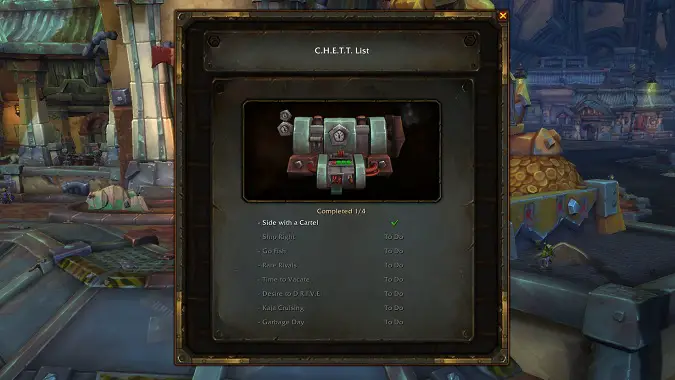 After you’ve completed four tasks you won’t be able to complete any more — your list is now complete. The first two lists you complete on your account have to be turned into C.H.E.T.T. and you’ll receive an additional 250 valorstones for doing so. After you’ve earned the achievement C.H.E.T.T.ing it Twice there is an additional option that’s sorta hidden: you can turn into the cartel quartermaster for reputation and gold.