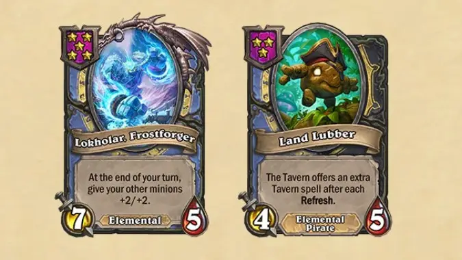 As seen in the picture above, it looks like Elementals will all share the light blue color of the Mage class, while Pirates will come in Rogue black — and a minion like Land Lubber, which is Elemental and Pirate at the same time, will have Elemental Blue on the left side and Pirate Black on the right. This may not seem like much, but it should ease the load on our brains just a tiny bit.