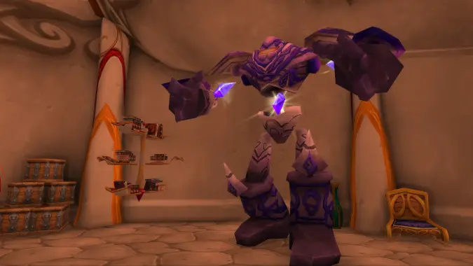 On my quest to find a good piece of furniture to keep my spellbooks, I found a nice hover-rotate model on Quel’Danas. However, the menacing arcane golem standing nearby caught my eye even more. If my house is a place where I am keeping my most prized possessions, my powerful magical weapons and armor, and (gasp!) my transmog wardrobe, I’m going to need a security system. A magically-powered construct seems like the perfect addition to the decor, and it can also fetch me snacks.