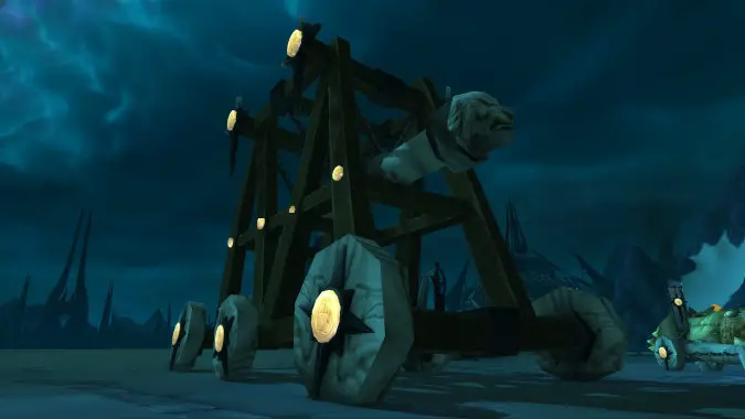 I went to one of my favorite old raids, Icecrown Citadel, to poke around for something I’d like to take home. I didn’t even get into the instance before I found the trophy I want: the battering ram that stove in the saronite door. I love everything about it — the polygonal wheels, the Argent Crusade logos, the head of an animal I can’t quite identify (probably a lion, but maybe a bulldog?). I want a little version to put in a trophy case, and I want a full-size version to sit front-and-center in my entryway.