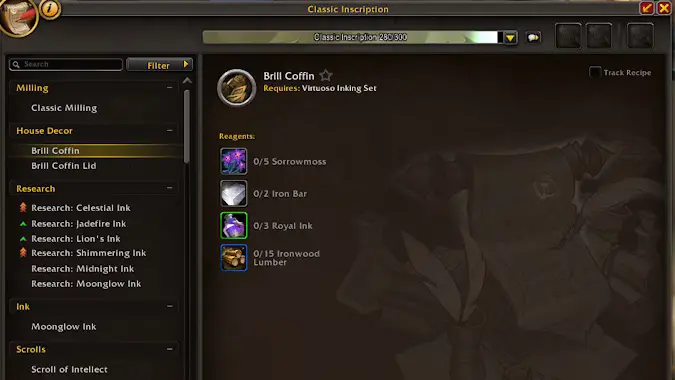 Rather than introducing a whole new profession dedicated to making furniture (sorry, folks who were desperately hoping they’d be able to take Woodworking), all non-gathering primary professions will be able to produce decor. As part of that whole “honoring the past thing,” there’s another level to this: all expansion tiers of professions will be producing furniture exclusive to that expansion, uniquely made with reagents from that expansion (including a new one!) The example shown off is Classic Inscription being able to make Brill Coffins, requiring materials we’re familiar with — Sorrowmoss, Iron Bars, and Royal Ink — as well as a new one, Ironwood Lumber. I suspect these new reagents will be where gathering professions get in on the housing market!