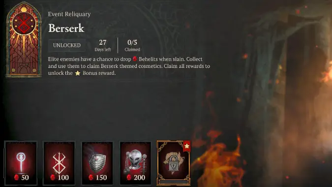 The Berserk event Reliquary is relatively inexpensive, and you should be able to unlock it fairly quickly as you progress to higher difficulty levels that are packed with elite mobs. All rewards cost a total of 500 Behelit.