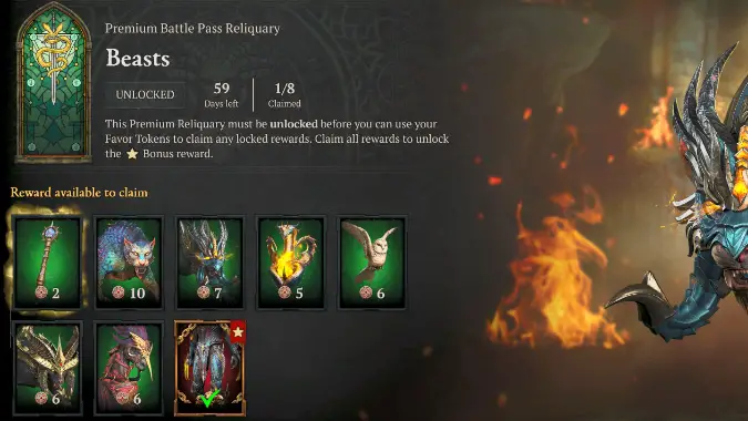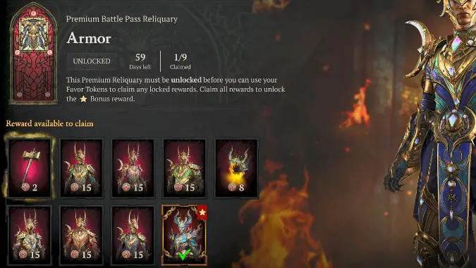 Starting from Season 8, Blizzard redesigned the Diablo 4 Battle Pass. The new system is called Reliquaries, and within a Reliquary you can purchase items (in any order you like) using an in-game currency called Favor, which you simply earn as you play. (Much like you used to earn favor to progress through the Battle Pass.) You can also buy each reward individually using the cash currency platinum, but we don’t recommend it, as the prices are quite high (and they’re on top of the platinum you pay to unlock Premium Reliquaries in the first place.) One season-themed Reliquary is free each season, but unlocking the premium Reliquaries will cost platinum — or you can buy the Battle Pass, which bundles all of the Reliquaries together for a discounted cost (1ooo Platinum for the Premium Battle Pass, 2800 Platinum for the Deluxe Battle Pass). But even these premium Reliquaries have one freebie, with one item available even if you don’t purchase it. When you buy everything in a Reliquary, you also get a bonus reward at no extra cost (this season, each bonus reward is part of an armor set).