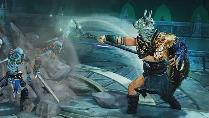 - Ferocious Strike: Swing and slam your staff, dealing damage over three attacks. Enemies other than your primary target take only 25% damage.