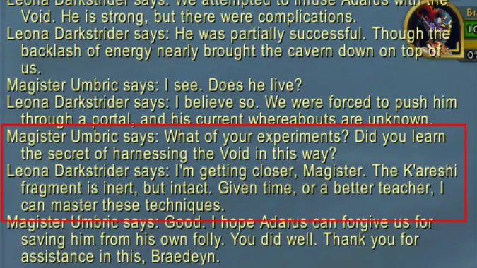 Additionally, whether or not we could save Adarus, Leona’s dialogue with Magister Umbric seems to imply that she intends to continue to pursue combining the power of the Void with the methods of the Illidari on her own time… or seek out someone who can: