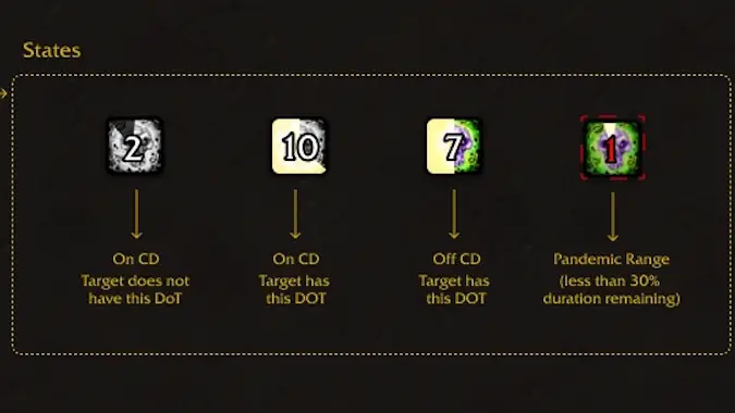 - Perhaps most importantly of all four, there will be a special red version of the swipe and duration, as well as a red icon glow, indicating the debuff is in “pandemic” range — an otherwise completely invisible mechanic that is crucial to how many debuffs work, in that it indicates the range that you can refresh the debuff (typically 30% of max duration) without losing any ticks.