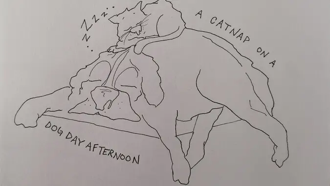 Today’s Bacardi is another drawing by my favoritest person! She really captured his love of snoozing, no matter the location. You also get a bonus St. Bernard! Two noses to boop must mean twice the luck, right?
