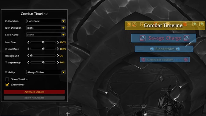 What can we infer from the screenshots? It looks like abilities will be announced using the build in scrolling combat text function, and there will be a timeline similar to the popular “Raid Ability Timeline” Weak Aura that displays information from your Boss Mod of choice. This timeline shows you the queue of upcoming abilities, with a countdown in seconds and a callout when they are at 5 seconds or less. Some abilities are shown as red, implying they are significant in a way similar to the nameplates showing abilities that will wipe the group if not interrupted, but we don’t yet know what criteria is used to display these abilities. The provided screenshot shows a tantalizing “Advanced Options” button which may offer more choices in what abilities are displayed and the time slice shown.