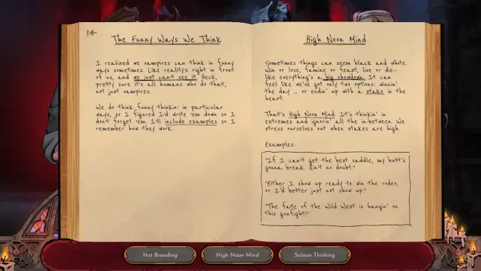 Vampire Therapist is a visual novel that allows you, as the Vampire Therapist, to help your fellow nightwalkers sort out their emotions, using concepts from real-world cognitive behavioral therapy to help your new friends and yourself talk your way to a healthier mindset. Sam Walls was a wild west gunslinger, so a lot of these concepts and explanations are phrased with that in mind — the concept of “Hot Branding” in the game, for instance, is the idea that you’re giving someone a fixed label based on an extremely limited set of data, and Sam’s understanding will evolve via coaching with his mentor into the real world term labelling. He writes examples of both these concepts, and a few examples of how they might be applied in talk therapy, to a notebook you can peruse when you’re presented with a challenge.