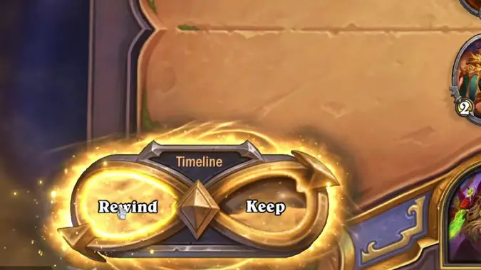 Basically, whenever you play a Rewind card, you get this shiny new UI element that lets you decide between rewinding whatever random effect the card just had if you don’t like it, or keeping it if you do. Iconic cards of the past like Unstable Portal have new versions: Semi-Stable Portal still adds a random minion to your hand, discounted, but at least you get the option to rewind it once if you want.