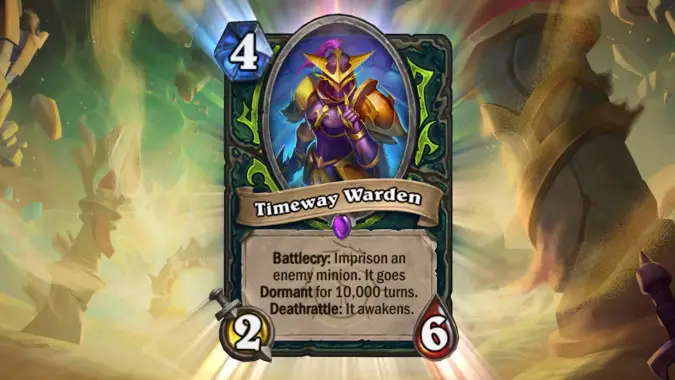 And Demon Hunters get one of the funniest cards ever in Timeway Warden, which imprisons an enemy minion FOR TEN THOUSAND YEARS TURNS — or until it dies, whichever comes first (assuming it didn’t get Silenced — which it totally should).