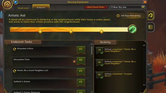 There will be plenty of players racing to max level on their homes, grinding tedious decor collecting tasks until they manage to get to level 5. These housing devotees may be showing off amazing (and intimidating) builds — but don’t let them make you feel like you need to keep pace. Player Housing is an evergreen feature that will continue to grow with the game. Play at the speed that works for you, and remember that early access is the hardest time to level your house. You don’t lose anything by taking it easy and focusing on earning XP when Endeavors launch.