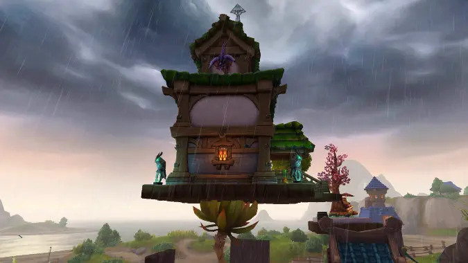 The latest trend players have adopted with the player housing system in World of Warcraft is to make their houses float up in the air. This was a bug initially: houses were not intended to be lifted up this way, and Blizzard had deliberately removed the arrow that would enable this vertical movement from advanced mode. But clever players found ways to access that vertical axis for their houses anyway, and soon, images and videos of floating houses started popping up all over social media.