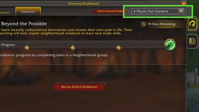 How can I choose which Endeavor to work towards? While you have access to one Endeavor for each neighborhood you are in, you can only participate in one Endeavor at a time, as your “active” Endeavor. To change your active Endeavor, open the housing dashboard (default hotkey H) and choose which house you wish to have active from the drop down menu in the upper right of the Endeavors tab, then select “Set As Active Endeavor.” You will be given a new list of activities related to the theme of the Endeavor in the neighborhood the house is located in, and any House XP earned will be applied to that house only.