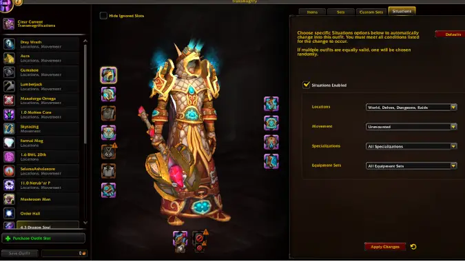 There are a wide variety of ‘Locations’ you can select from such as Rested Areas, Home, World, Delves, and Dungeons. Each can have their own designated Outfit or, if you’ve got the gold for a large number of Outfit slots, a whole array of potential Outfits. You can also set up Situations for Class Specializations, Talent load-outs, and saved Equipment Sets.
