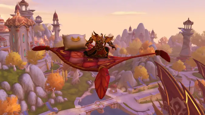 Four total mounts are available at the Trading Post: three returning from last March and one brand new mount. The new mount is the Comfy Silvermoon Flying Quilt for 550 Trader’s Tender while the returning mounts are the Ruby Butterfly and Pearlescent Butterfly for 700 Trader’s Tender each, and the Shimmermist Free Runner for 325 Trader’s Tender.