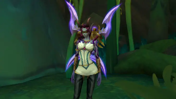 The first character I’m taking into Midnight, my Void Elf Devourer DH, is actually employing a neat trick I discovered where the Azshara dress from Legion Remix will “stretch itself” around certain pants — those that have a “bulkier” shape at the top, like the Gilnean Noble’s Trousers. The result is that the top ends up looking kinda like a short dress. It looks cool! I would say I am, in fact, fashionably prepared (especially since that character is a Demon Hunter).