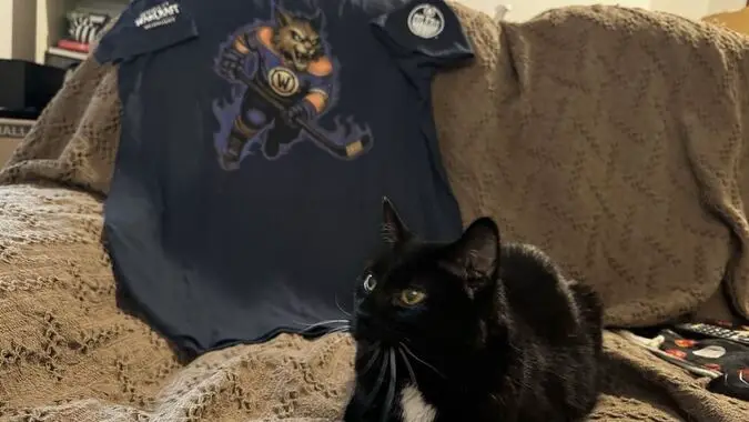 I love it when two of my interests come crashing together like a pair of hockey players slamming each other into the boards! Once again, World of Warcraft sponsored an Edmonton Oilers game, and they were exceedingly kind in inviting me along for the ride! The Blood Elves came back to support the Oilers, and there were prizes, pizzas being parachuted down from the ceiling, and a cool limited edition t-shirt of the Oilers mascot, Hunter the Lynx, glowing all void-y with the Warcraft W on his chest.