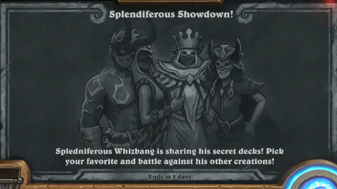 This week, we have a brand-new Hearthstone Tavern Brawl, and it’s a pretty fun one. Splendiferous Showdown! revives the decks provided to you by Splendiferous Whizbang, a legendary card that gave you an experimental deck that broke the normal rules of the game. In this Brawl, you’ll simply pick a class and be provided with whichever deck Whizbang had for that class, and then play a normal game with it.