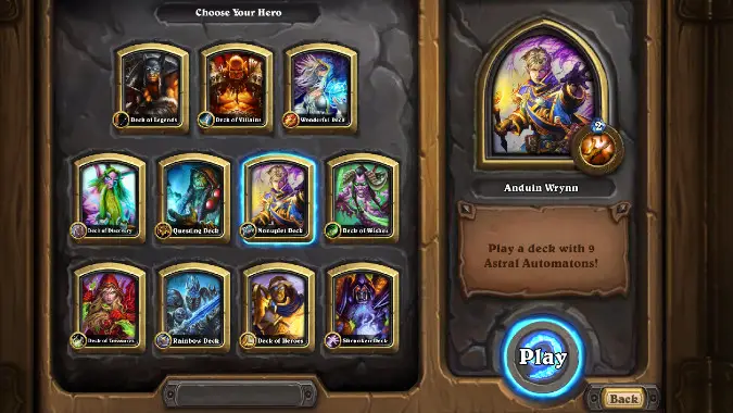 For another easy option, go with the Priest’s Nonuplet Deck. You’ll be playing nothing but Astral Automaton, and cards that give you even more Automatons than your starting nine, such as Zola the Gorgon and Celestial Projectionist. It’s very straightforward, and your gameplan is pretty obvious, but it works, as long as you’re also keeping your opponent under control with your cards like Holy Smite, Holy Nova, and Lightbomb.