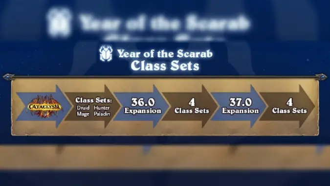 Class sets will have a staggered release throughout the year, with four new sets coming out with each expansion. However, the math doesn’t quite work out here. Blizzard has announced that Restoration of Azeroth, which is attached to the Cataclysm expansion, will have the four class sets for Druid, Hunter, Mage, and Paladin. Then, the next expansion (patch 36.0), will have class sets for four more classes. And the final expansion of the year (patch 37.0) will have four more class sets. However, there are only seven classes left currently… so either Blizzard has miscounted (unlikely), one class is getting double cards (also unlikely), or there’s a new class due out later this year.