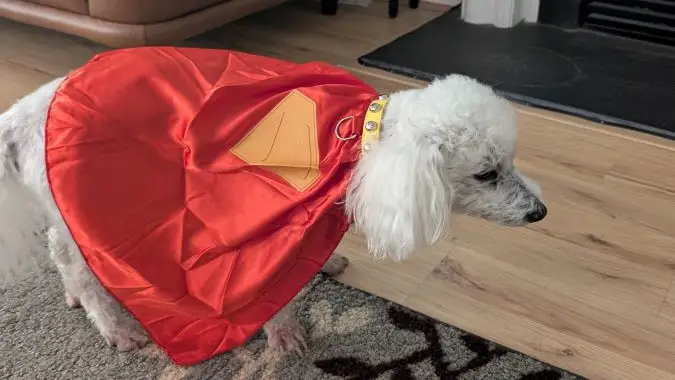 More powerful than a post-walk treat! Can leap on to tall beds with assistance — it’s Marshmallow! If you can’t tell his Halloween costume this year is Krypto, the hero of this summer’s Superman film! … he’s not fond of costumes, hence the dour expression. Still, he looks awesome! And would totally attack Lex if needed.